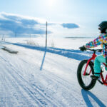 オホーツクの冬。流氷と白い砂浜のあいだを、ファットバイクでゆっくり走ります。ペースは無理なく。氷の真横を進みながら、冬の海のスケールを間近で感じます。
