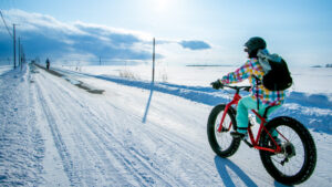 午後は、ゆるめのファットバイク。スタートは「遺跡の森」。林の雪道を抜け、ライトコロ川沿いへ。途中は野鳥を眺めつつ、サロマ湖の撮影ポイントでひと息。写真タイムもしっかり取ります。運がよければ、アザラシに出会えることも。ツアーには「常呂遺跡の館」のミニ見学つき(開館状況により調整)。冬のサロマを気軽に楽しむ、午後だけのコンパクトプランです。